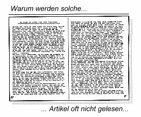 So wird allein durch Spaltenschreibweise die Lesbarkeit fast verdoppelt. Illustrationen, Graphiken und Bilder sind augenfreundlich, d.h. es strengt das Auge weniger an, diese Seite anzuschauen. Das gesamte Erscheinungsbild ist aufgelockert, die Artikel scheinen interessant und werden gelesen.