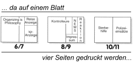 Der Seitenspiegel wird so aufgezeichnet, wie die Zeitung später aussieht, zuerst das Titelblatt, dann die erste Doppelseite (Seite U2/3) usw., die letzte Seite der Zeitung wieder einzeln.