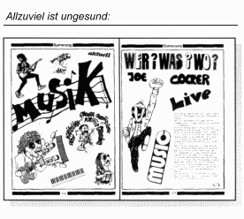 Genauso verwirrend ist es, wenn jeder Artikel der Schülerzeitung oder Abizeitung mit einer eigenen Schriftfamilie arbeitet. Bei der ersten Layoutbesprechung müssen ein oder zwei Schrifttypen für Überschriften festgelegt werden z.B.: eine serifenlose Schrift wie die Helvetica und eine weitere Standardschrift wie Courier. Finger weg von Zierschriften, Handschriften, Effektschriften in 3D). So schön es vielleicht ausschaut, aber die Lesbarkeit der Überschrift nimmt immens ab.