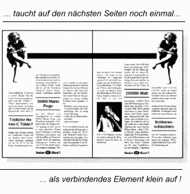 Ein graphisches Element oder ein Photo einmal zu Beginn des Artikels groß abgebildet, wird später wiederholt. In kleinformatigen Variationen über die gesamte Artikellänge verstreut, zeigt es der Leserschaft, dass sämtliche Textfahnen, die mit diesem Element in Zusammenhang stehen, zum gleichen Artikel gehören.