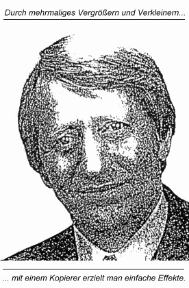Ein zweiter Effekt ist das Verfremden von Photos. Ein Photo wird so oft vergrößert und die Kopien dann wieder verkleinert und diese Kopien dann wieder vergrößert. Dadurch verschwinden die Grauanteile und ein reines Schwarzweißbild bleibt übrig, das sich oft sehr vom Original unterscheidet und sehr verfremdet ist. Durch dieses Hoch- und Runterkopieren wird dieses Photo oder vielleicht nur ein Ausschnitt davon sehr augenfällig und damit brauchbar fürs Layout einer Schülerzeitung oder Abizeitung.