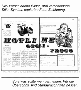 Insgesamt soll der Gesamteindruck der Zeitung ausgeglichen sein. Sie darf nicht zu langweilig erscheinen, aber auch nicht überfüllt mit graphischem Feuerwerk sein.