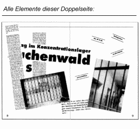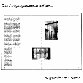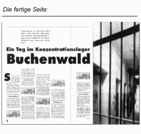 Du bekommst von der Redaktion einen Text, der circa 60 cm lang ist, bereits formatiert ist und genau 6 cm breit ist. Der Artikel berichtet über einen Besuch im KZ Buchenwald. Der Schreiber des Artikels hat Dir noch zwei große Photos gegeben. Du hast für den Artikel die Doppelseite 8/9.